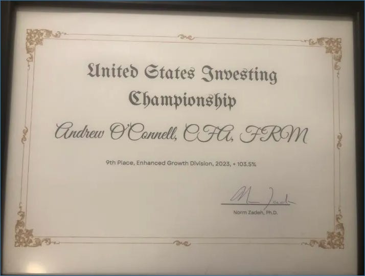 From oversizing trades, overtrading, getting social media FOMO, doubling down on mistakes, blowing accounts, and obsessing over the market, I’ve made almost every trading mistake possible, and have been able to overcome those struggles. In fact, I generated a 103.5% annual return in the 2023 U.S. Investing Championship, finishing in the top 6% of participants. I competed again in 2024 and generated a +254% return, finishing in the top 3% of participants. My goal is to keep competing, build a longer track record, and launch a hedge fund.