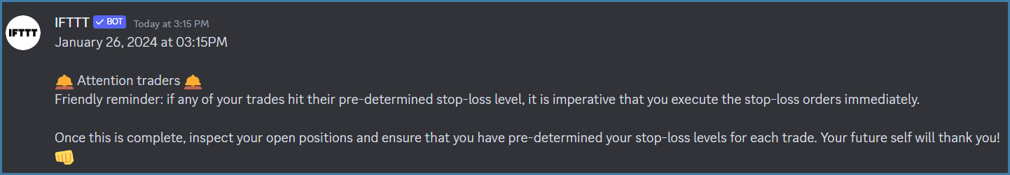 Adopt better trading psychology through our Discord community. We’ve cultivated a great group of traders that are all focused on long-term success. Our goal is to string together good trading years, not good trading days, and we understand the importance of risk control. I recently added the following automation that appears every trading session at 3:15 PM in our trading-room chat. It is already helping us in a big way!