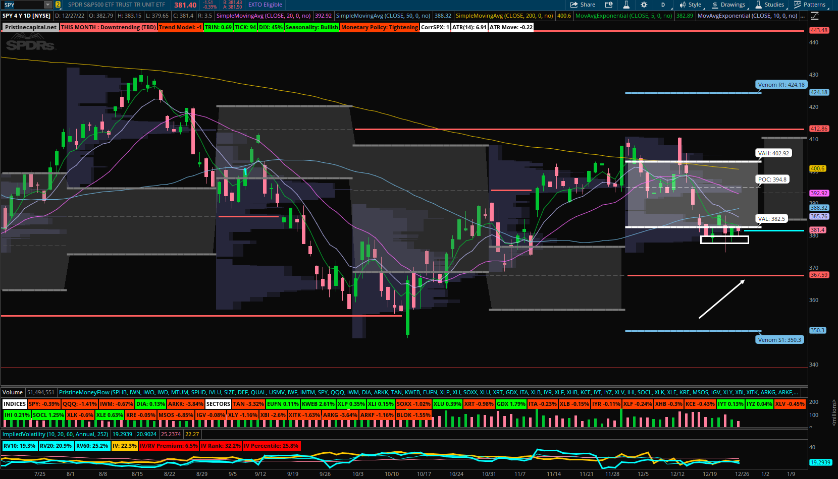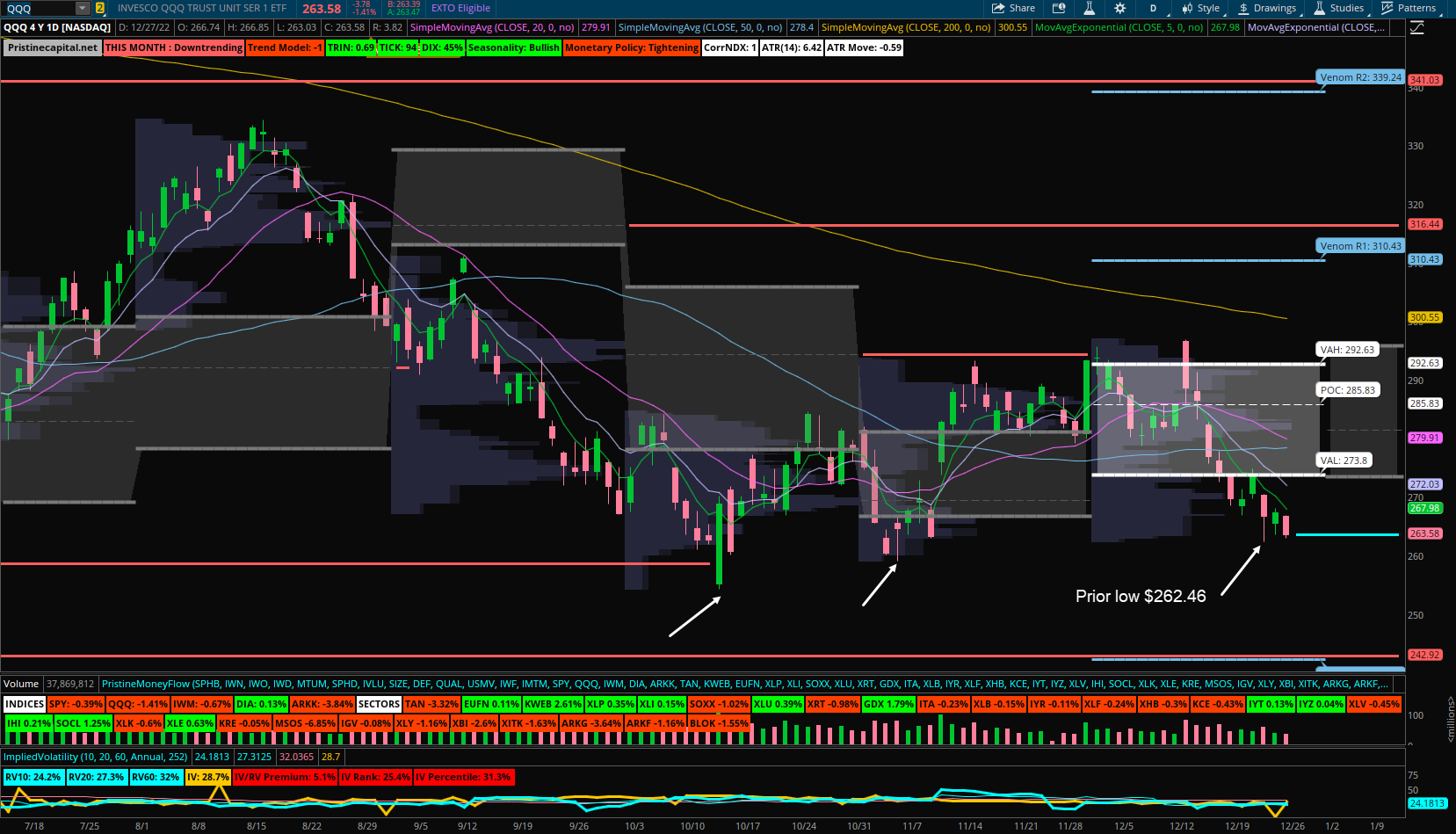 I find it interesting that despite both NVDA and TSLA imploding during today’s session, we were not able to take out the QQQ $262.46 low of day from 12/22. It is worth monitoring the Nasdaq closely over the next few sessions to see if this level holds. If it does, that could present an opportunity for a long bounce trade with tight risk control, using the prior low as a pivot point.