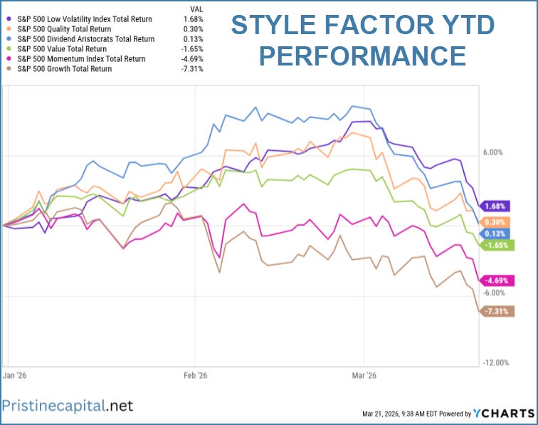 The safe haven Low Volatility and Quality style factors are now following rest of the market lower. Growth led from 2023-2025, and is now lagging in 2026 👇
