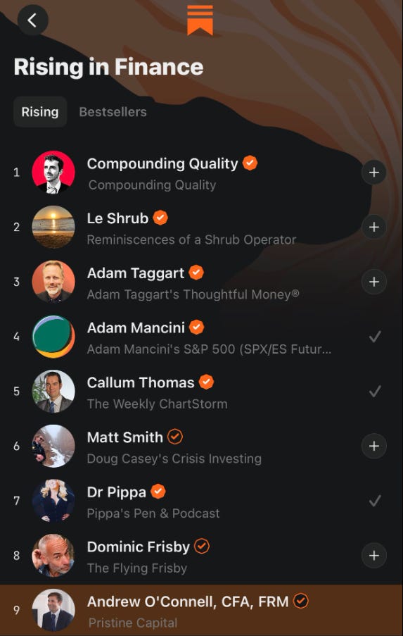 PS - Pristine Capital is now the #9 fastest growing publication in the Finance category on Substack! This wouldn’t be possible without you. I am incredibly grateful for your support!