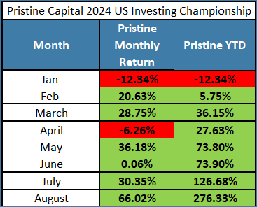 I just reported my August results to the US Investing Championship. This was the best trading month of my career at +66.02%, bringing our YTD return to +276.33%. There is still plenty more trading left in 2024. Nothing is guaranteed.