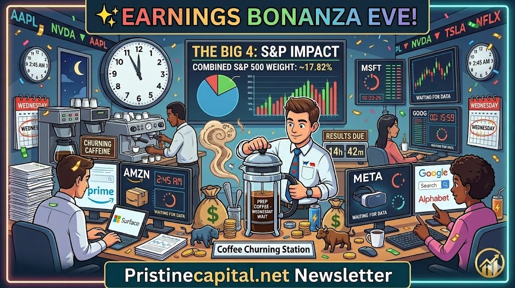 The Elite 8 earnings bonanza kicks off on TOMORROW with MSFT AMZN META GOOG reporting results after the bell! These stocks make up a combined ~17.82% weight in the S&P 500. To say this could be market-moving would be an understatement. Let’s take a look at the market setup into the event. HAGE 🍻