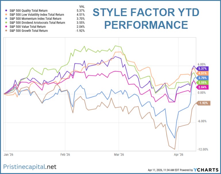 Equities staged a massive bounce-back rally, but the top two style factors YTD are Quality and Low Volatility. Growth is the worst performer, which is the opposite of what we saw from 2023-2025👇