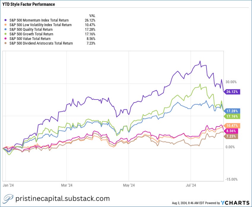 The momentum style factor was +38% YTD just a few weeks ago, and has corrected down to +26.12%. Zooming out, this is still a stellar performance👇