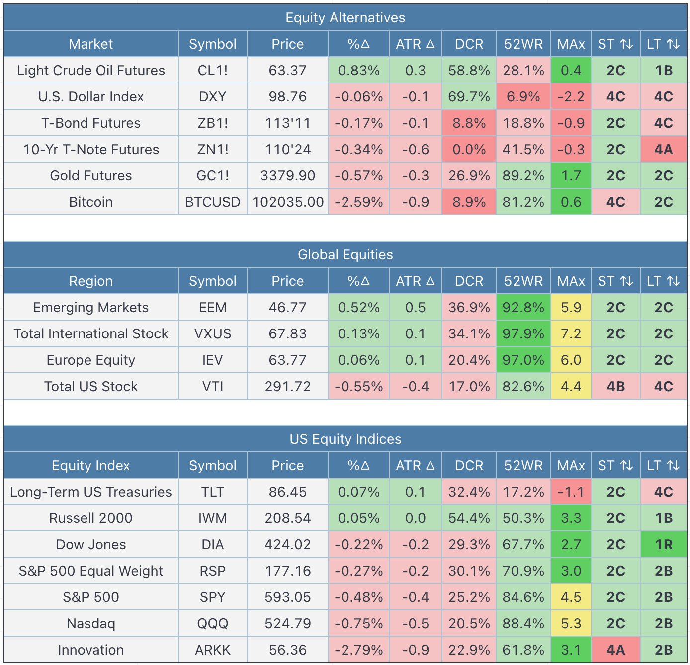 There is a mild risk-off tone across markets, with US equities and alternatives under pressure, while global equities—especially outside the US—show relative resilience.