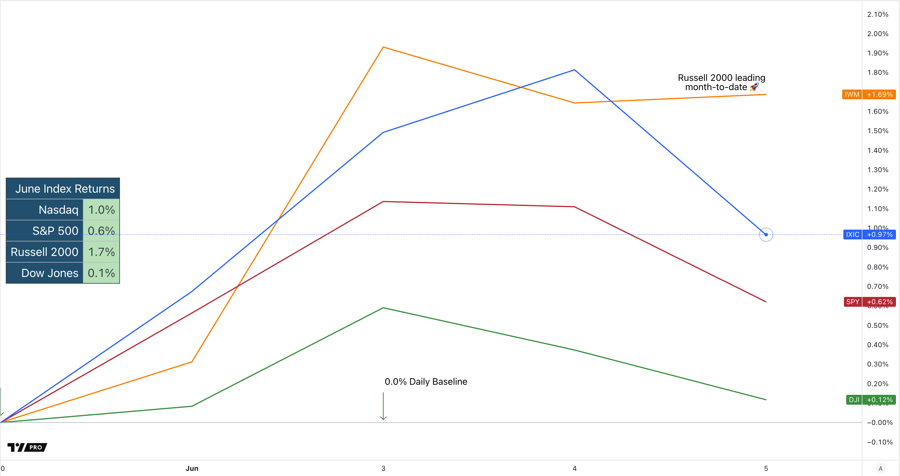 Russell 2000 (IWM) holding a slight lead month-to-date, up 1.7%! 👇