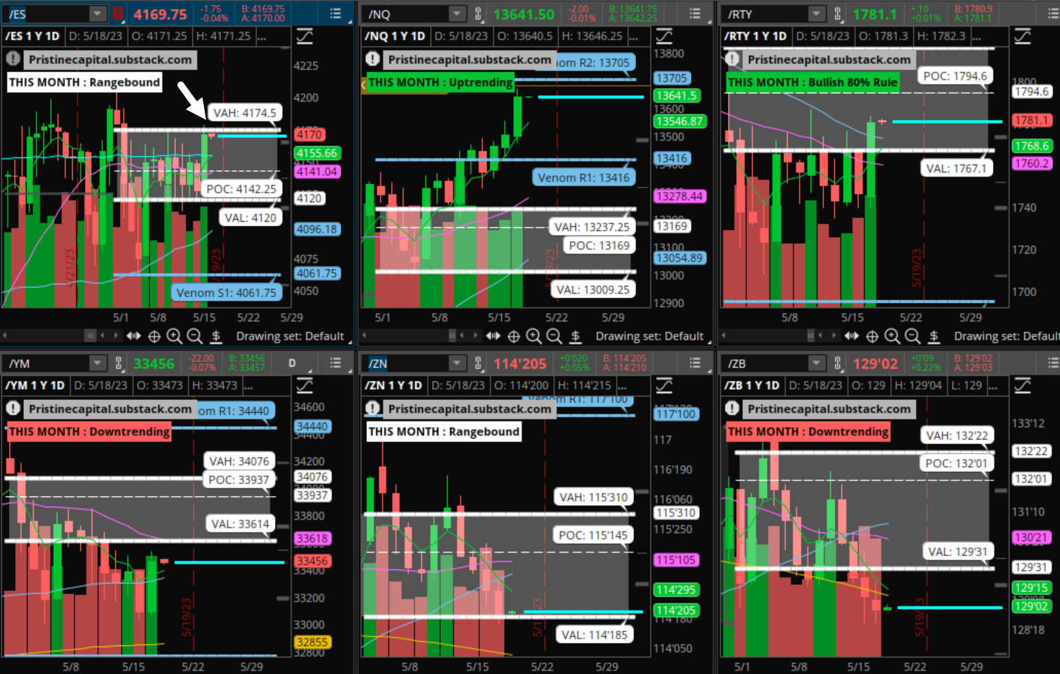 Every index looks completely different. ES is flirting with a breakout from the monthly value area, while the NQ is approaching the R2 pivot from the monthly value and is in overbot territory. The RTY Russell 2000 was today’s outperformer and just broke back inside of the monthly value area.