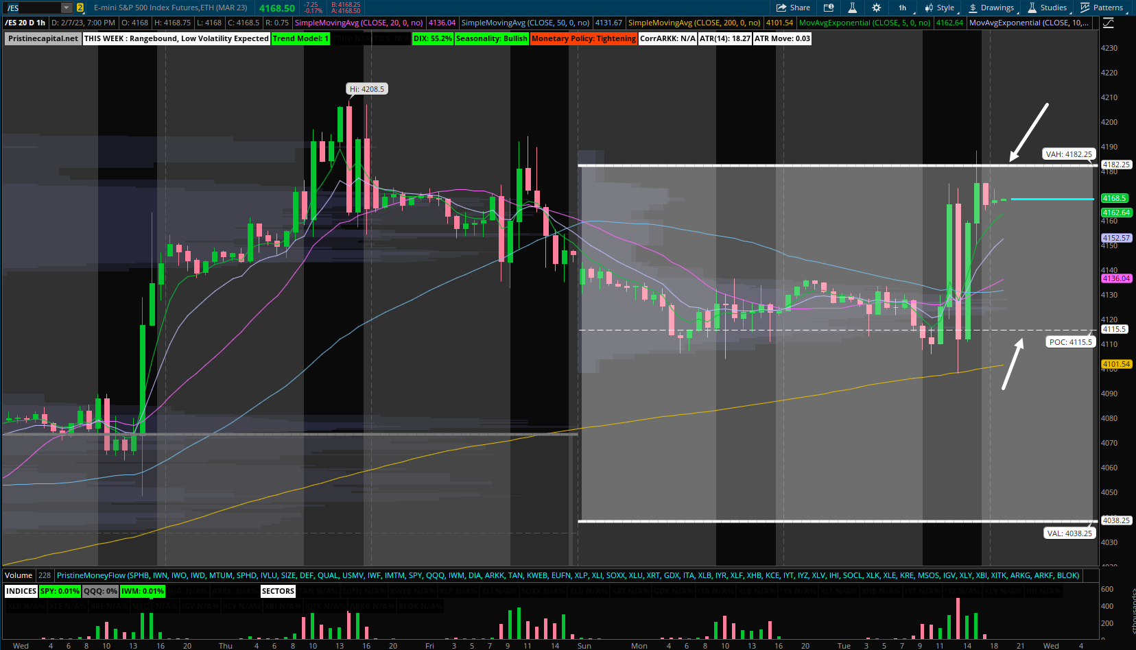 The S&P 500 undercut the weekly POC 4115.5 multiple times throughout the session, but buyers stepped in to defend that level each time. As we mentioned in last night’s newsletter, a failure to get traction below the weekly POC targets a move to the top of value 4182.25. So far we’ve rejected off the top of value, but it is worth monitoring tomorrow for a breakout from value: