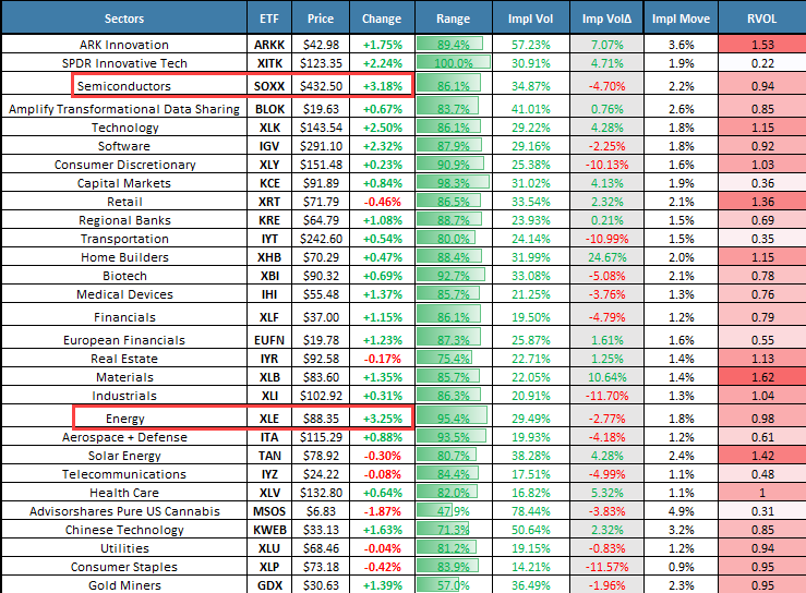 SOXX semiconductors and XLE energy led today’s action. AI related groups all outperformed