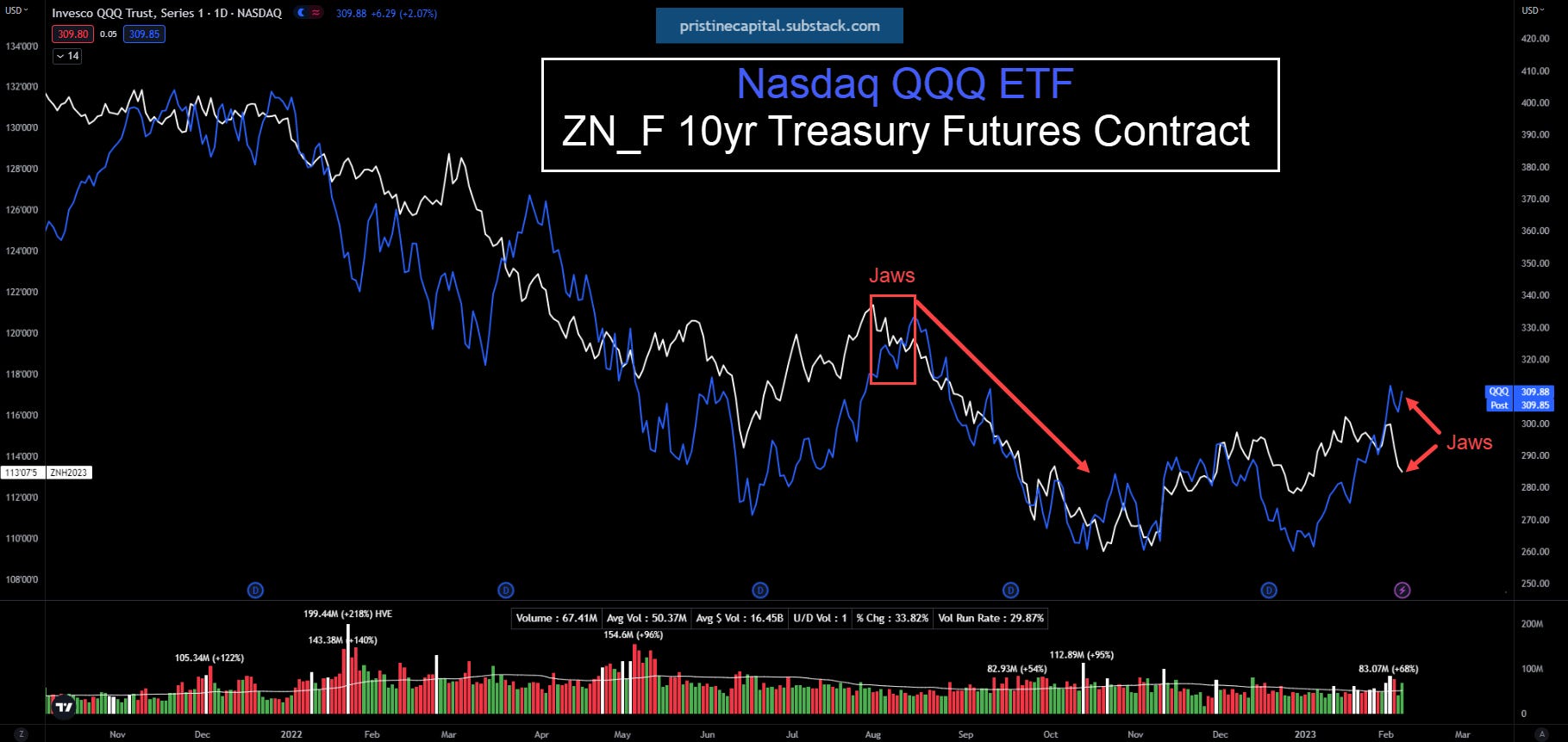The Nasdaq is typically the most highly sensitive equity benchmark to movements in long-term interest rates, but it continued to diverge from treasuries as it rallied +2.07% for the session! Beware of the jaws!