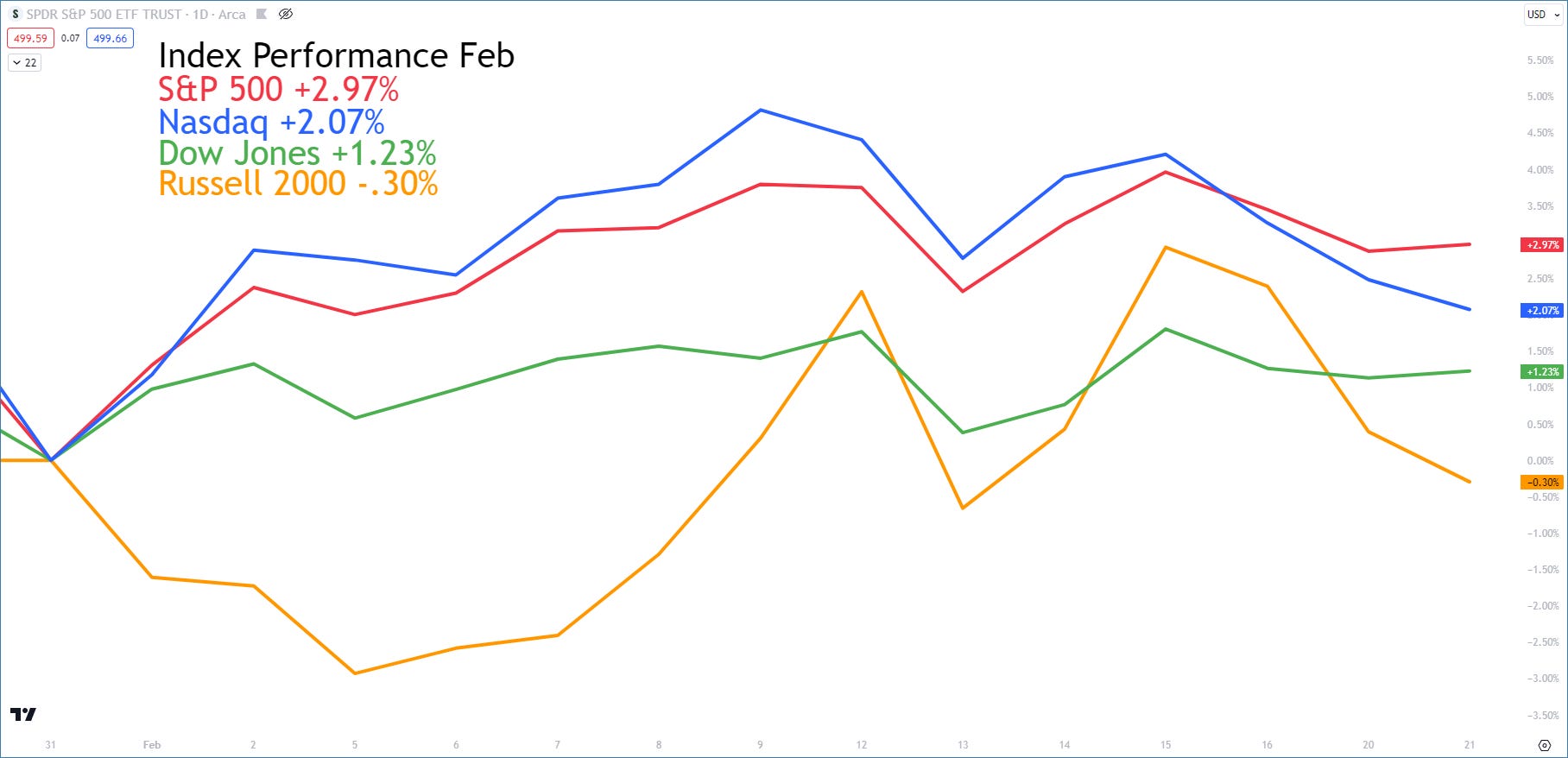 Considering the weak February seasonality, this month is shaping up to be strong! But small caps are lagging. I believe the small caps will have a catch up trade at some point this year! Important to be vigilant for when this rotation occurs👇