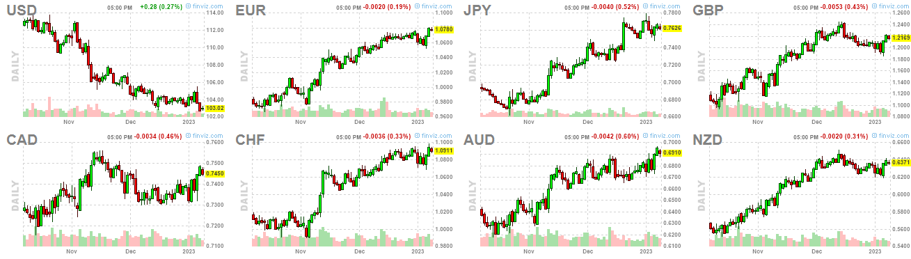 Green across the screen, with rotation out of the XLP consumer staples group and XLV healthcare. Money is flowing out of defensives, and being deployed in more speculative areas of the market, contrary to the price action we experienced throughout almost all of ‘22:
