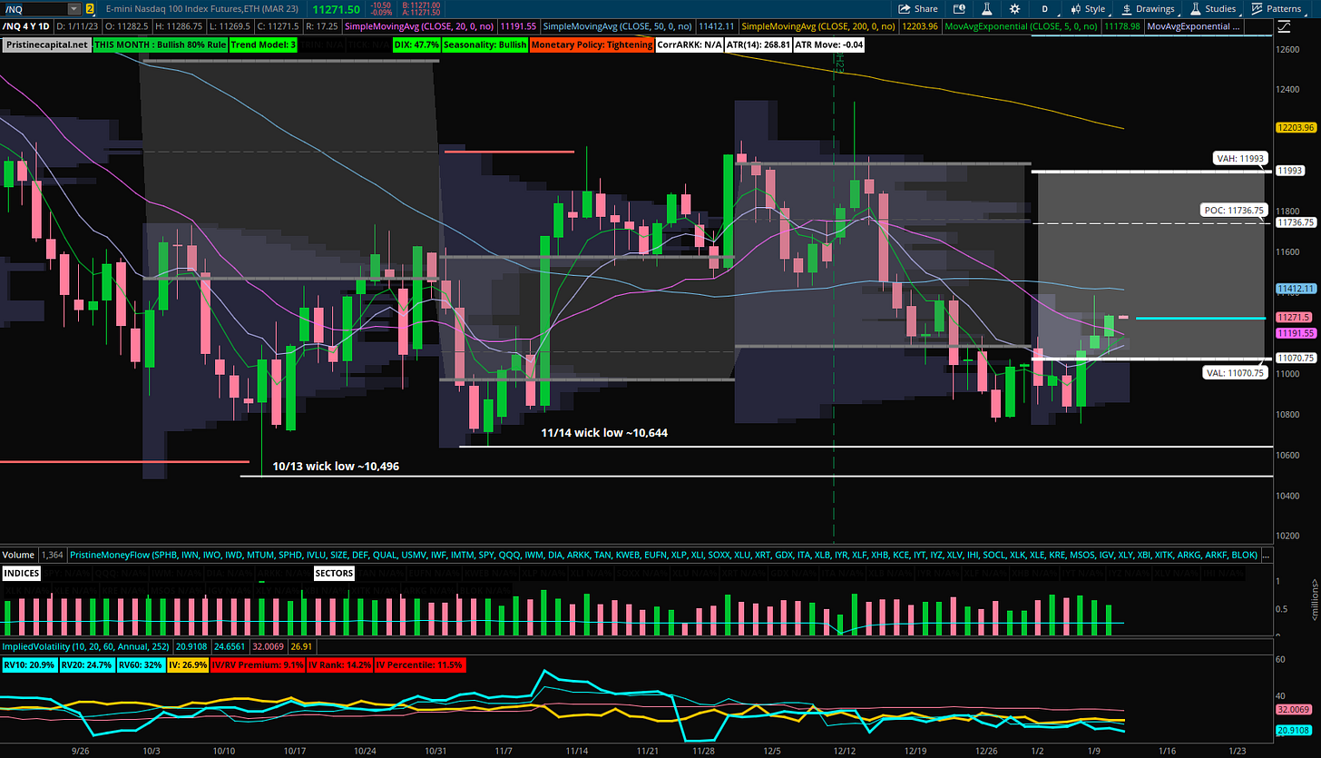 The S&P 500 finished the session +.70% and above the yearly POC ~3919.75, but below yesterday’s high of ~3975.00. I see the setup into Thursday’s CPI event as completely binary. On a lighter than expected print, the S&P 500 could push up to 4000 in a flash, while if the numbers come out hotter than expected, it could flush down to 3800 just as fast: