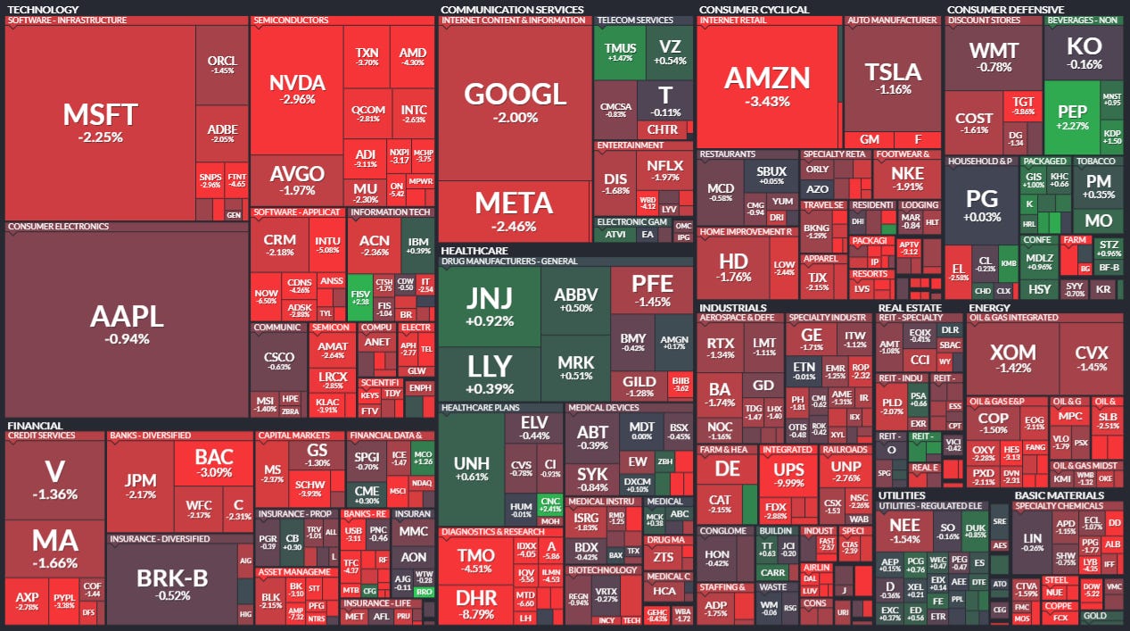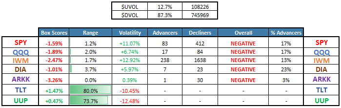 All headline indices fell sharply, bread was extremely weak with only 12.7% advancers, and investors fled to the safety of TLT long-term treasuries.