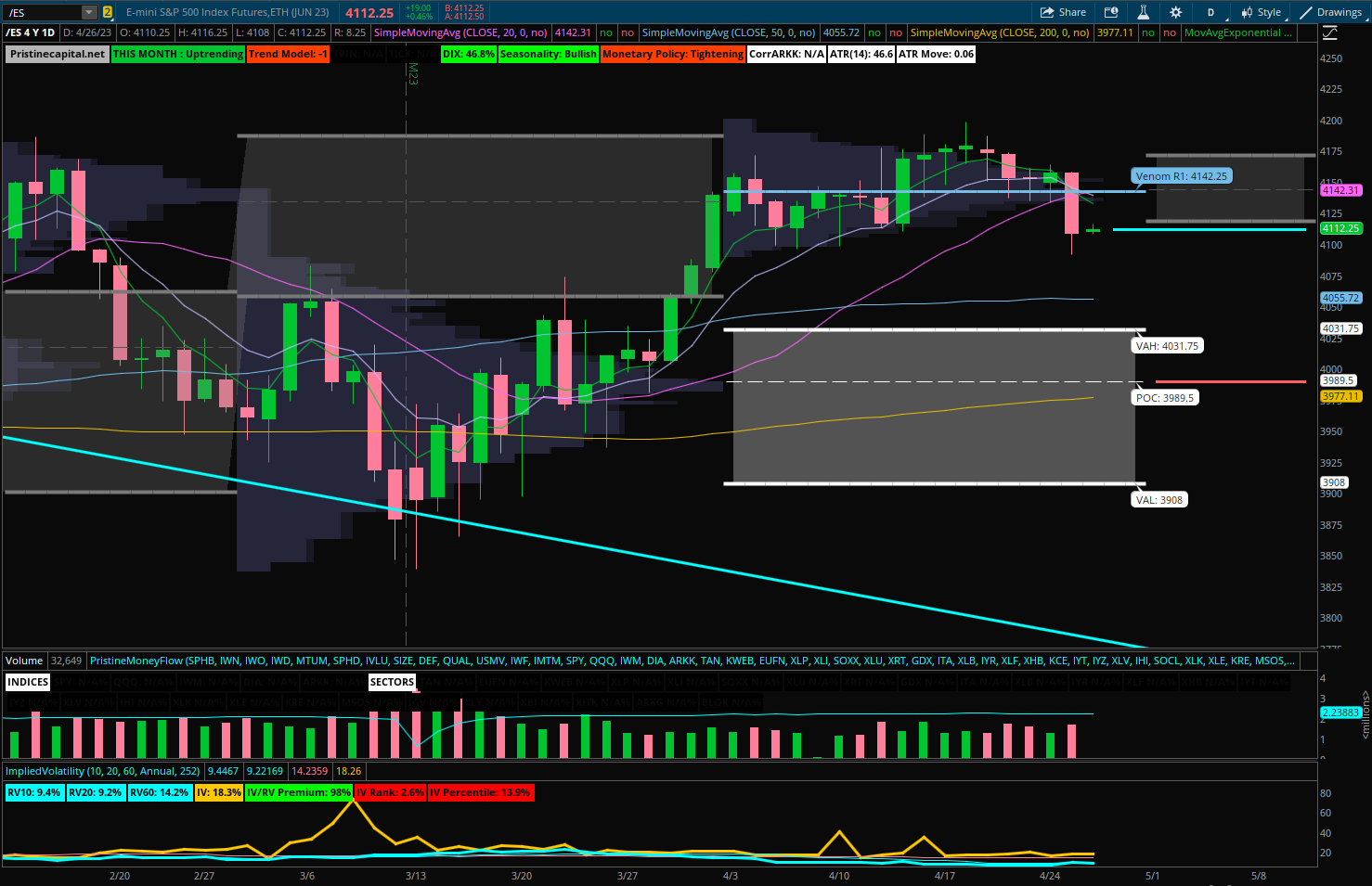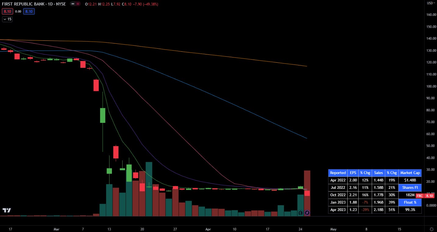 Equities sold off and volatility zoomed higher today after FRC First Republic Bank reported earnings…and fell 49.38% in a single session! When the daily candles are living inside the volume bars…that’s when you know you have a problem on your hands.