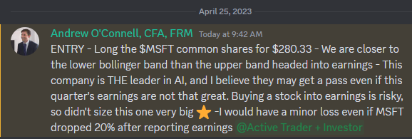 We purchased the MSFT common shares this morning ahead of the earnings report given Microsoft’s unique leadership position in the AI race, and the fact that the stock was trading down at the lower bollinger band ahead of the print!