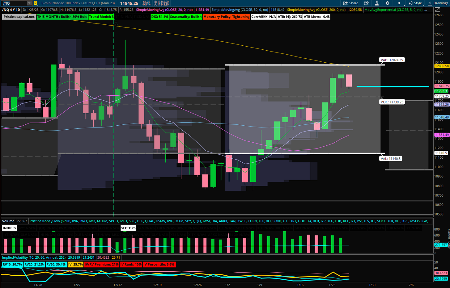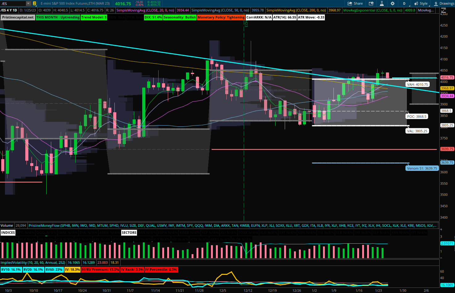 The S&P 500 held above the 5-Day EMA and monthly VAH 4010.75.
