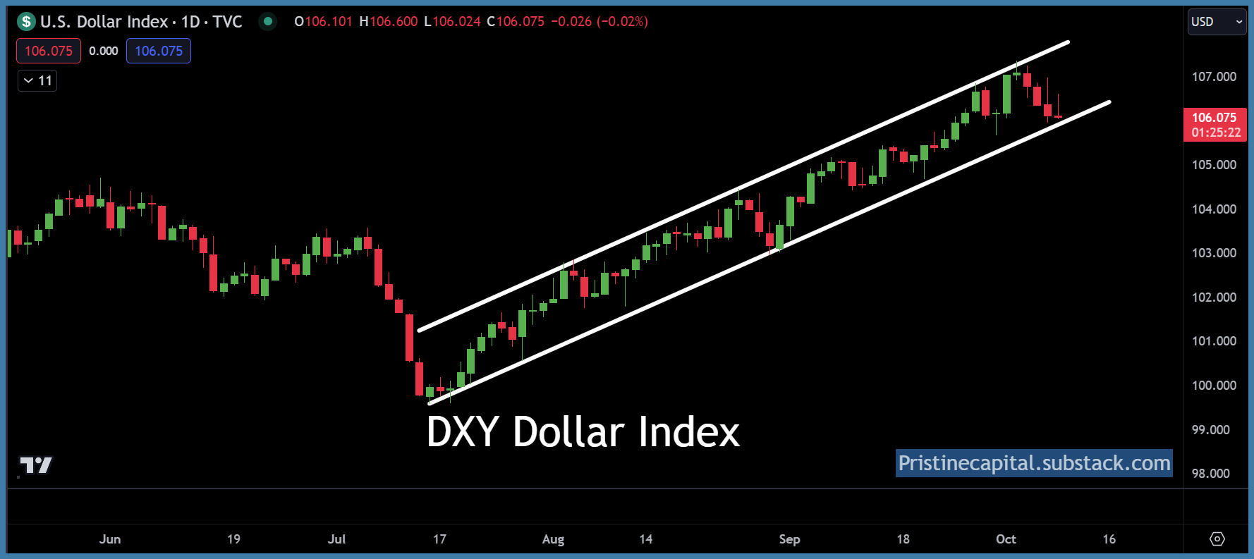 The Dollar index is testing the bottom of the bullish trend channel. A weaker dollar is BULLISH for risk assets.