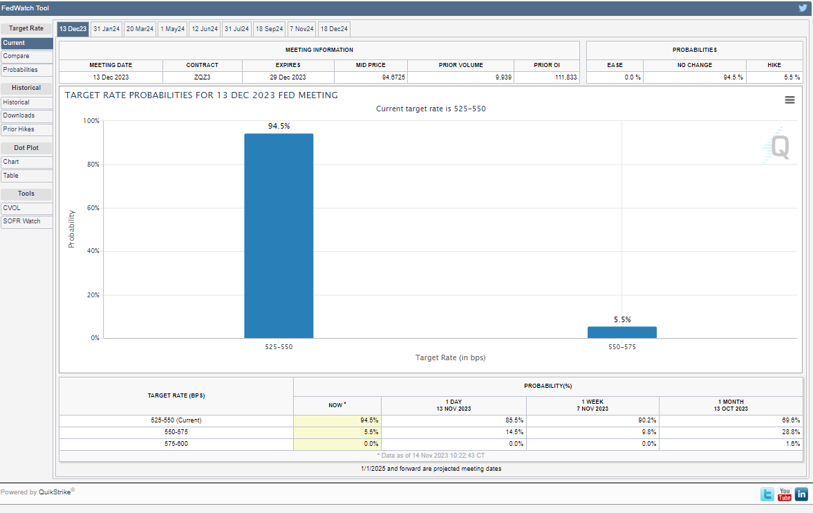 There is now a 94.5% probability that the fed will hold rates steady at their December meeting. Bullish!