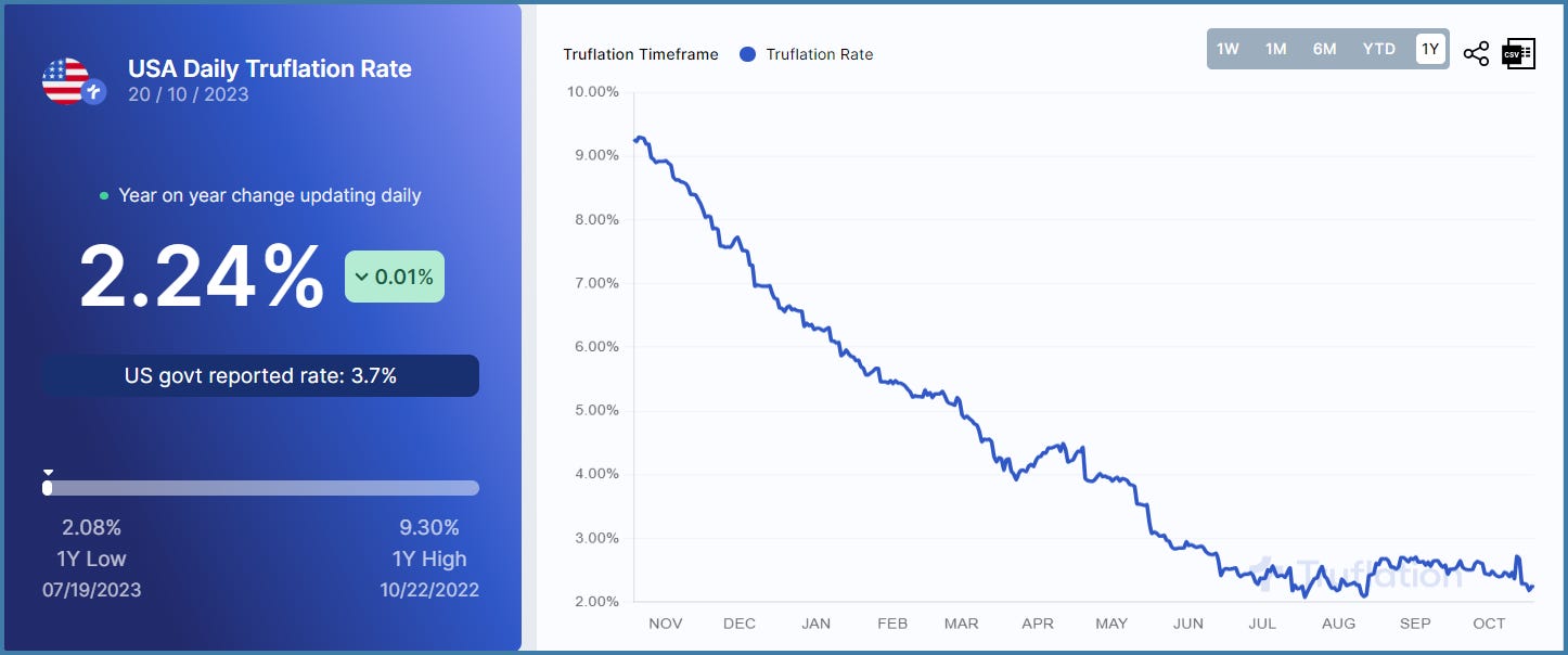 While there may be fear of further supply chain disruptions as a result of conflicts in the middle east, and those fears are jolting markets in the short-term, it is important to acknowledge that the real-time Truflation rate is decreasing.