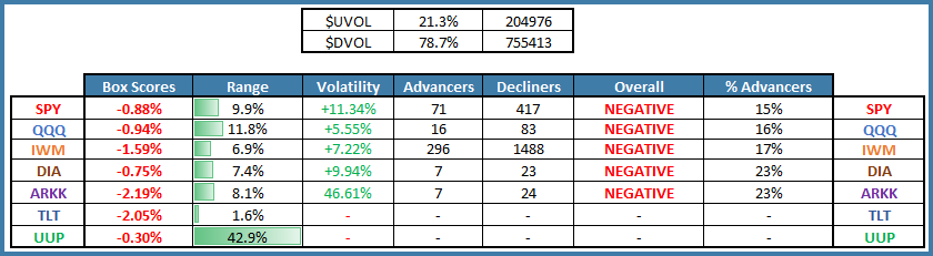 Equities finished with only 21.3% advancers. Poor closing ranges across all tracked equity indices, and a spike in volatility