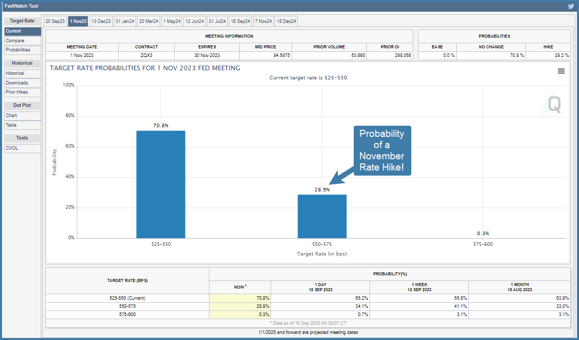 The probability of a November rate hike decreased from 36.4% to 28.9%. This could certainly change after tomorrow’s Fed meeting. Stay tuned!
