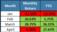 I finished the month of April -6.26% and am now +27.63% YTD. I’ll be reporting these results to the US Investing Championship.