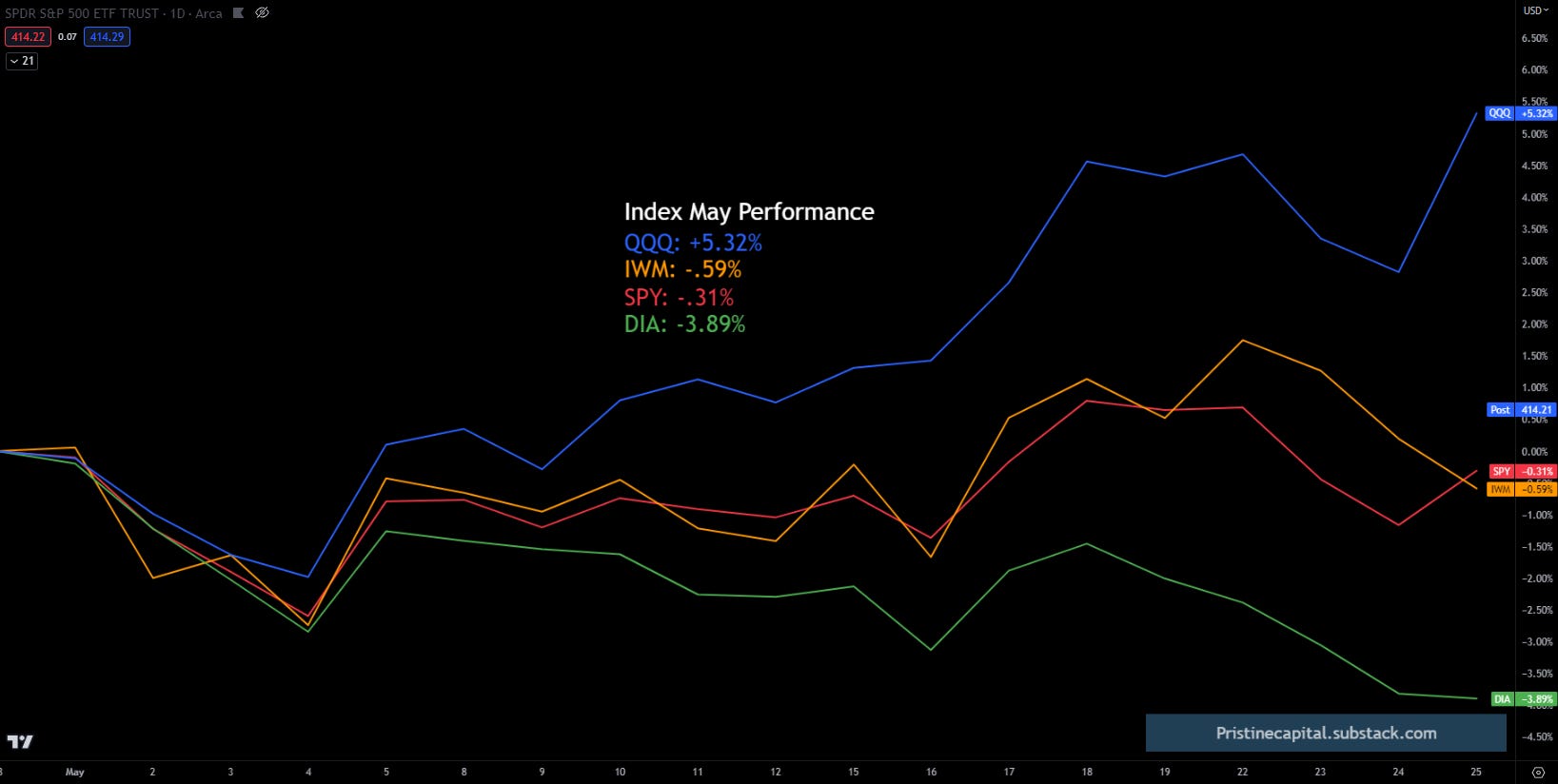 The Nasdaq QQQ remains the only index in positive territory for the month of May.