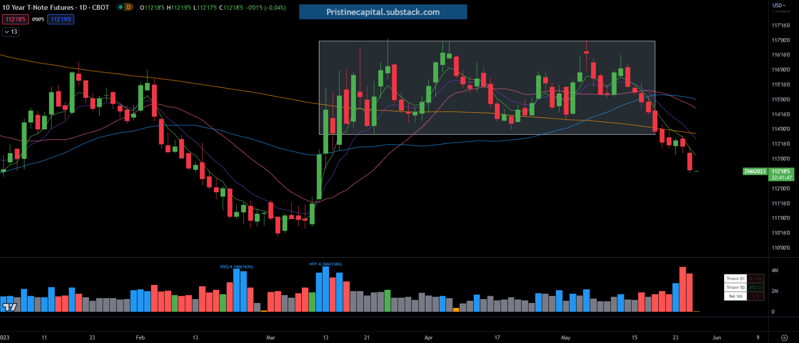ZN_F 10yr treasury futures are struggling to hold a bid as investors worry over a potential US debt default. They are approaching levels last seen before the banking crisis erupted.