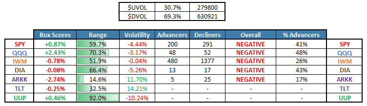 SPY and QQQ advanced today, but overall market breadth was weak with only 30.7% advancers: