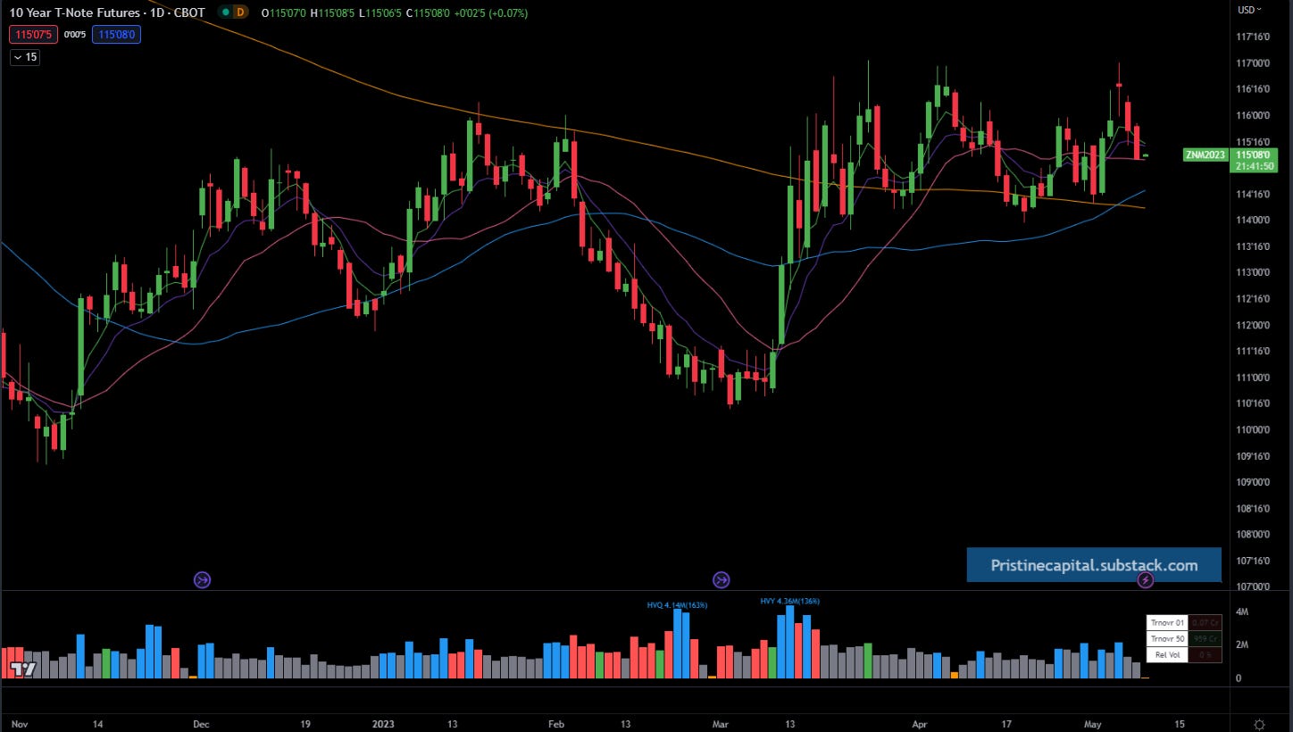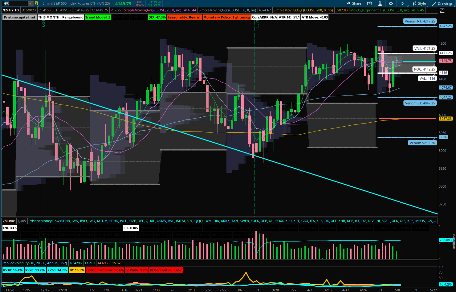 The S&P 500 is once again trading back above the 20-day SMA. The monthly value area is very thin for May, which means a large directional move is likely to kick off sooner rather than later. It’s important to not be fooled by how calm the market is right now. From stability comes instability.