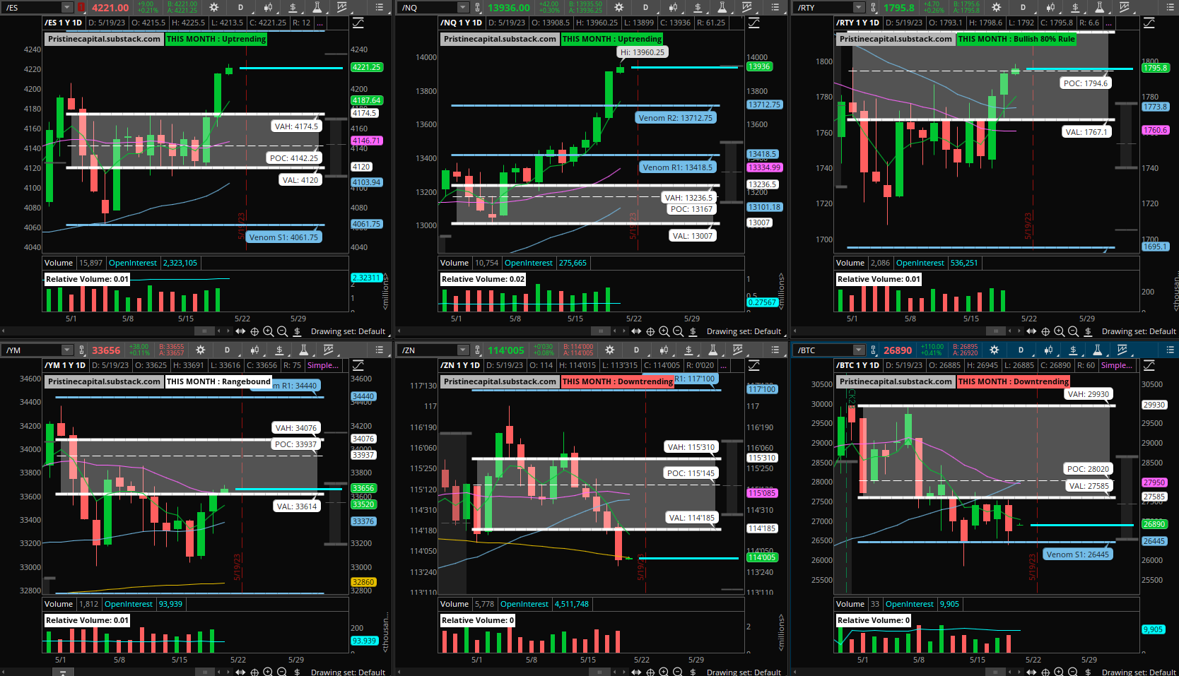 The ES broke out from the monthly value area and closed above it. The NQ Nasdaq blew through the R2 pivot and also finished on the highs. The YM Dow Jones and RTY Russell 2000 are a bit further behind in the price cycle, but they both made progress. Bitcoin and treasuries remain in downtrends.