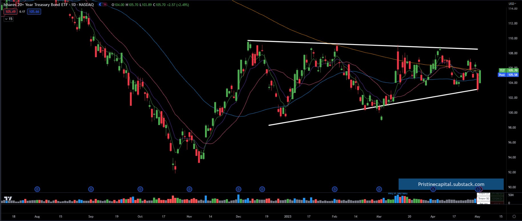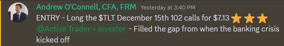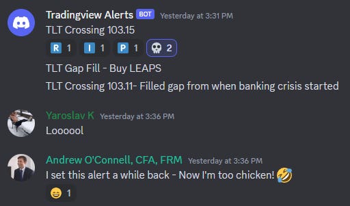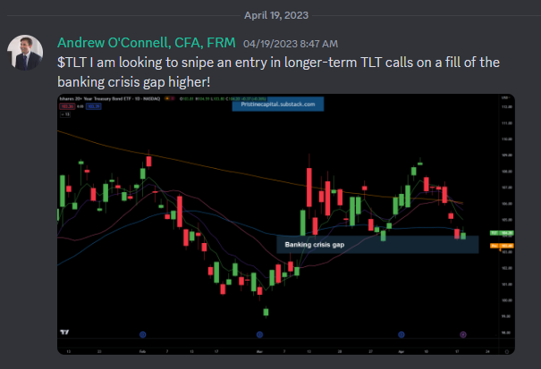 We were positioned for this move via TLT calls that we entered on yesterday’s gap fill from when the banking crisis began!