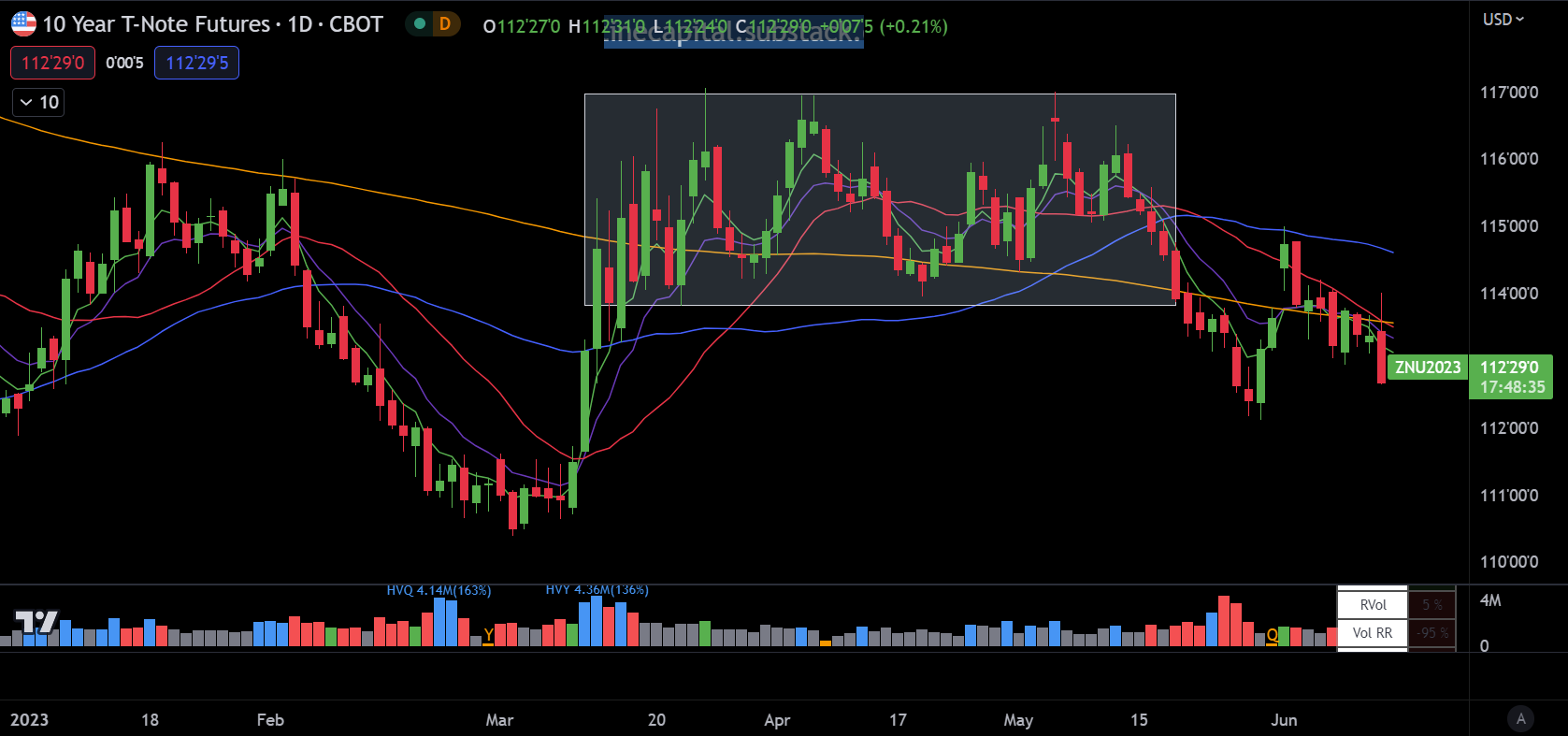 I am shocked at how weak US treasuries were today considering the light CPI print. 10yr treasury futures put in an ugly red candle and closed on the lows!