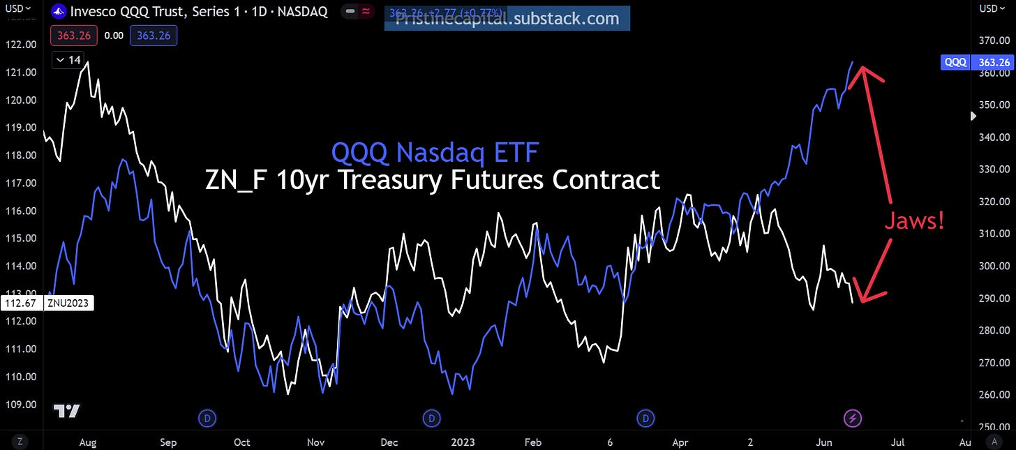 The jaws setup expanded as QQQ technology traded higher while ZN_F 10yr treasury futures sold off. These jaws are going to snap soon, and investors will claim that no one could have ever seen this coming. All of the evidence is in plan sight.