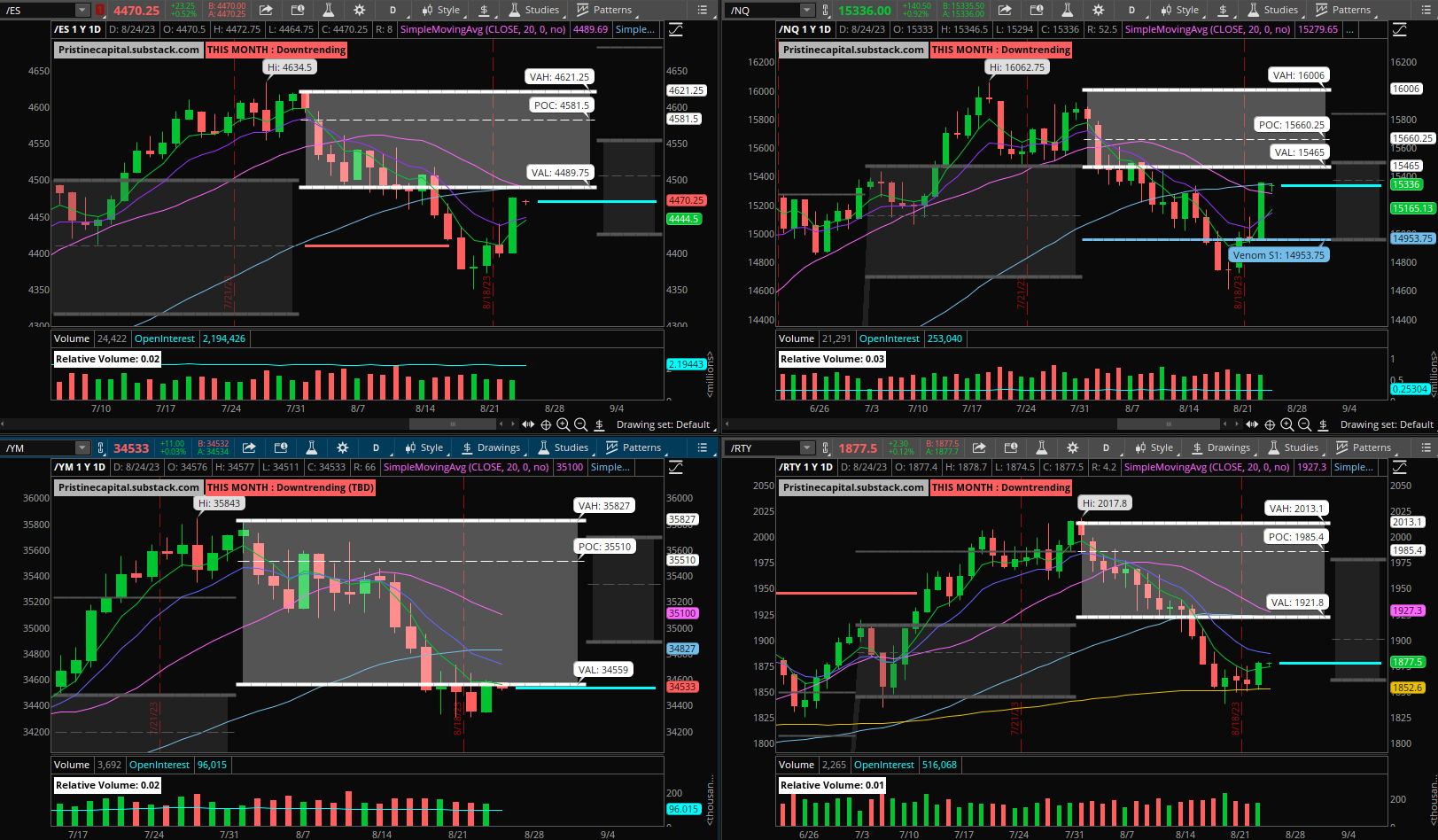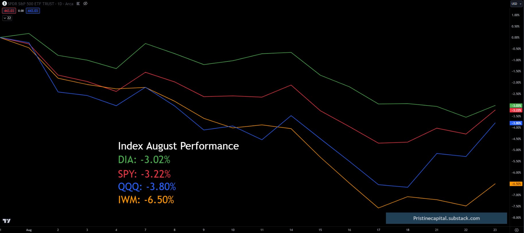 The Equity Indices remain in a pullback for August, albeit a smaller one than a few days ago.
