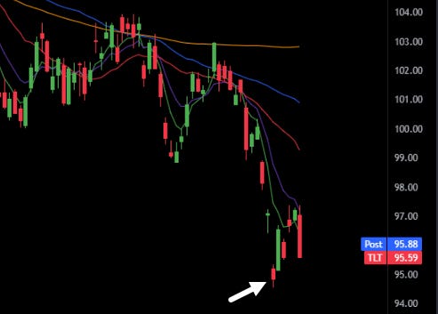 TLT Long-term treasuries gave back almost all of their bounce! Bonds are sitting on the knife’s edge, meaning we are trading close to the recent lows, as well as the Oct ‘22 lows!