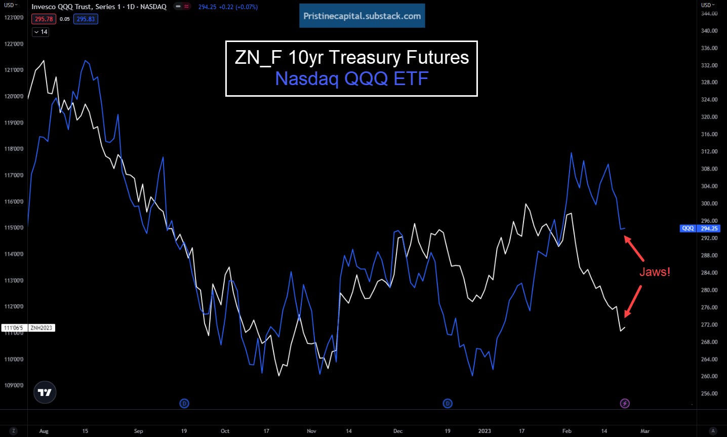 While it’s tough to believe that the market could have more room to fall after the recent selling, the jaws setup between the Nasdaq and the 10yr treasury futures contract is still in play! A convergence here implies further downside for technology stocks.