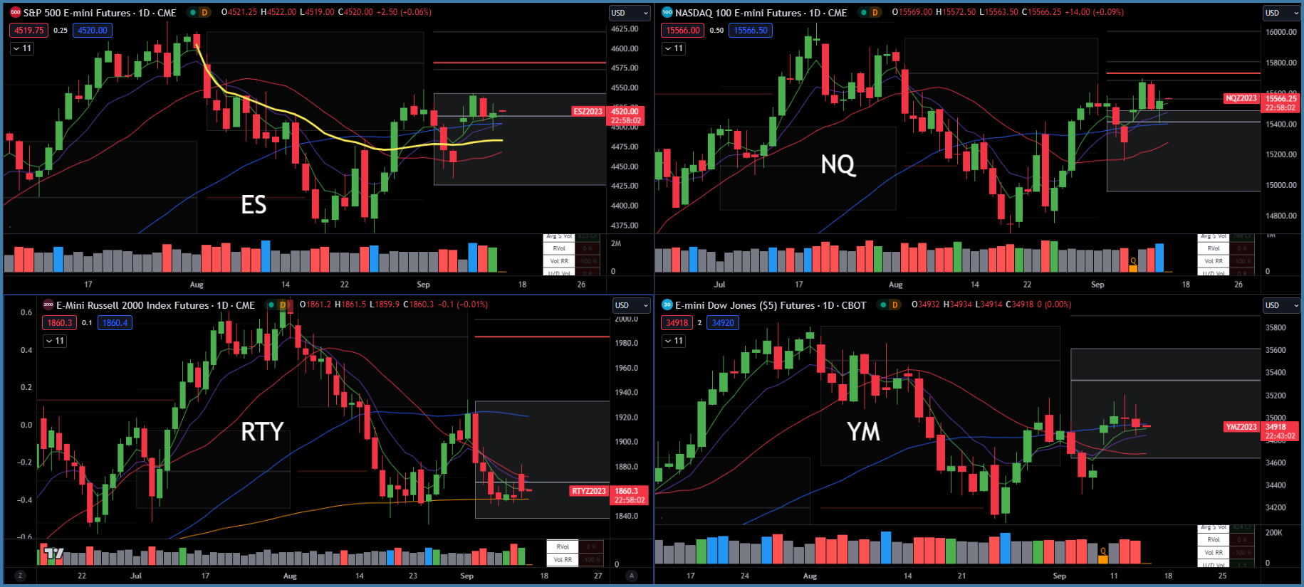 YM Dow Jones - Above key moving averages and inside monthly value area