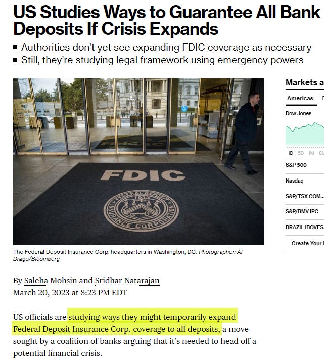 American’s giving up on the banking system is one of the most alarming things I’ve seen in recent years. With banks struggling to hold onto deposits, the US credit creation system will likely take a big hit, and with less credit comes big problems for real Americans in the real economy. We are likely headed for a significant recession, and with it, weak future earnings. But if this results in more liquidity for financial markets, can this end up being a good outcome for stocks? As perverse as it is to say it, we can’t rule it out. And we also can’t rule out more monetary intervention! Check out the story that just dropped on Bloomberg 👇