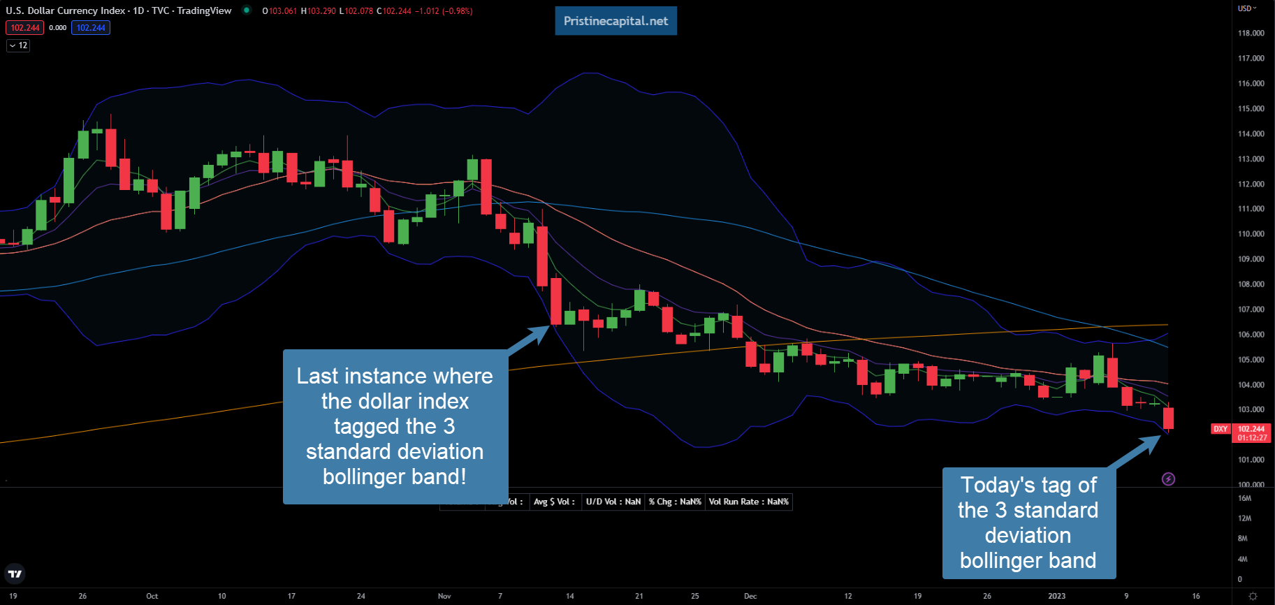 The dollar index tagged the 3 standard deviation bollinger band for the first time since 11/11 (oversold)