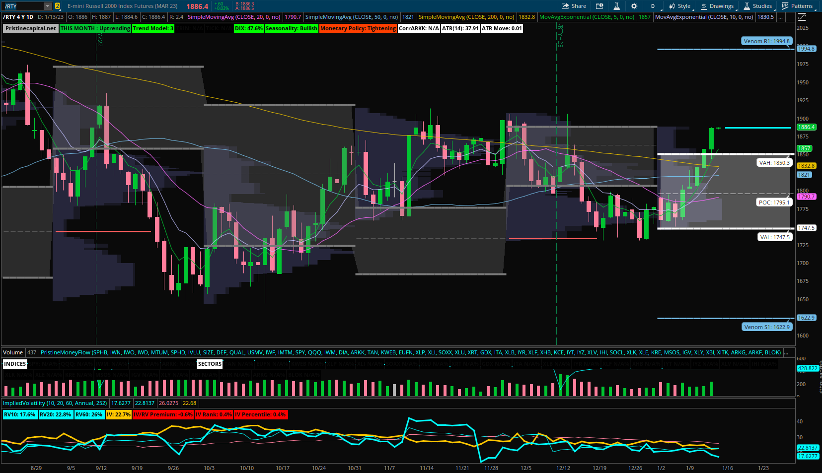 The Russell 2000 is ahead of the other headline indices in it’s price cycle, and is already trading above the monthly VAH ~1850.3
