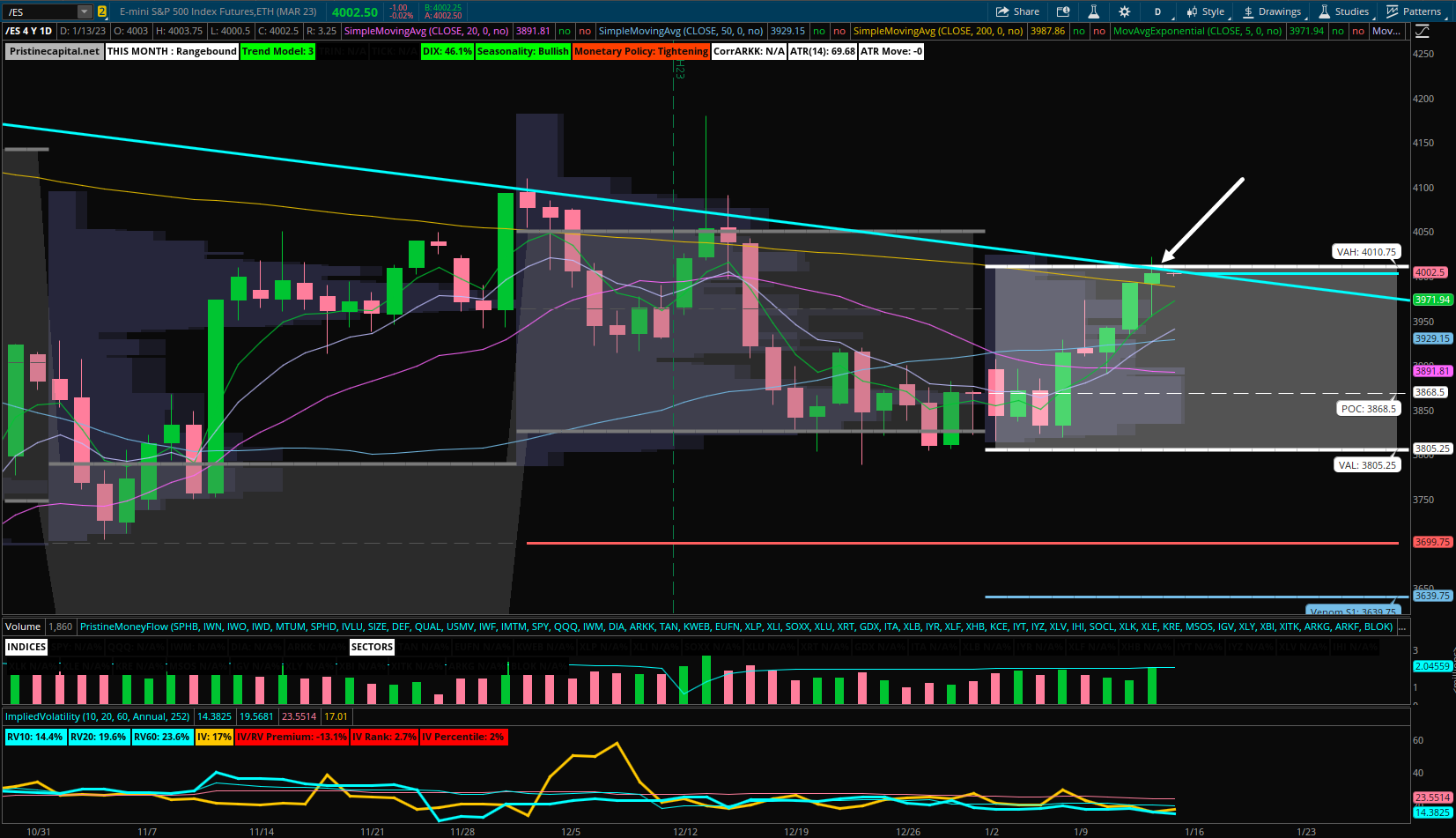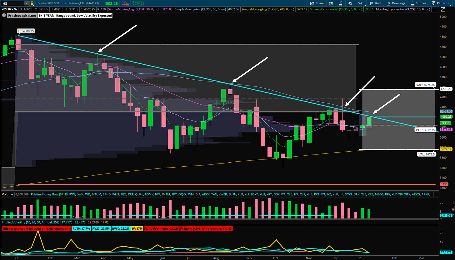 The teal downward trendline happens to coincide with the monthly value area high of ~4010.75: