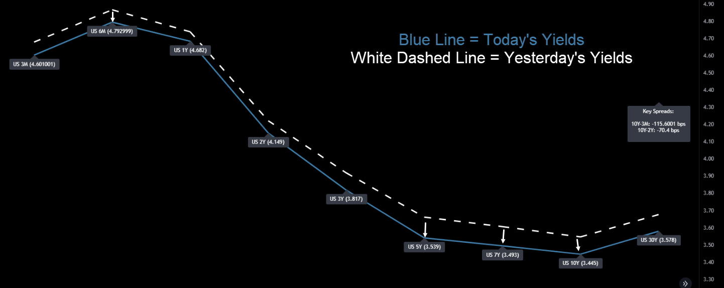 Yields across the curve moved lower, signaling that the bond market believes the fed will do less monetary tightening than previously expected, and/or future economic growth is going to slow down!