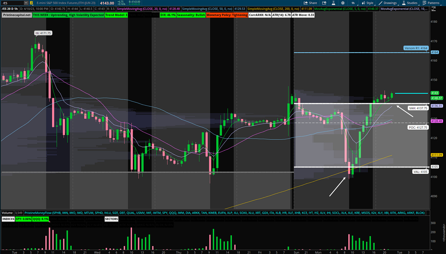 The S&P 500 shook out below the weekly value area low ~4,105 this AM before rallying all the way back up to the top of value. If you anchor on Friday’s futures close, nothing happened, but if you anchor on this morning’s lows, it feels as if we are in a voracious market rally. It all depends on your timeframe.