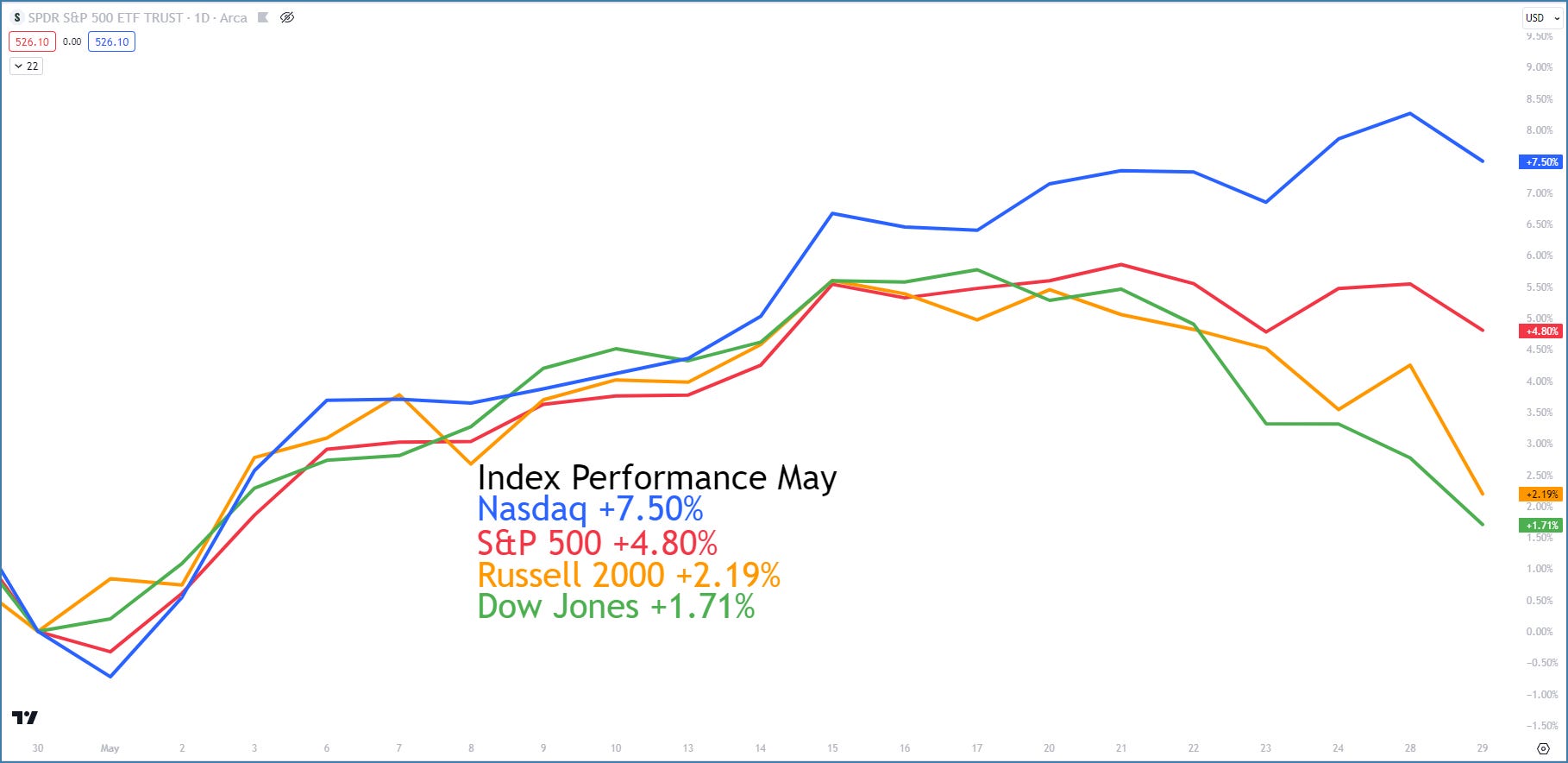 The Russell 2000 and Dow Jones are looking pretty ordinary for the month of May, but the Nasdaq is still looking extraordinary👇