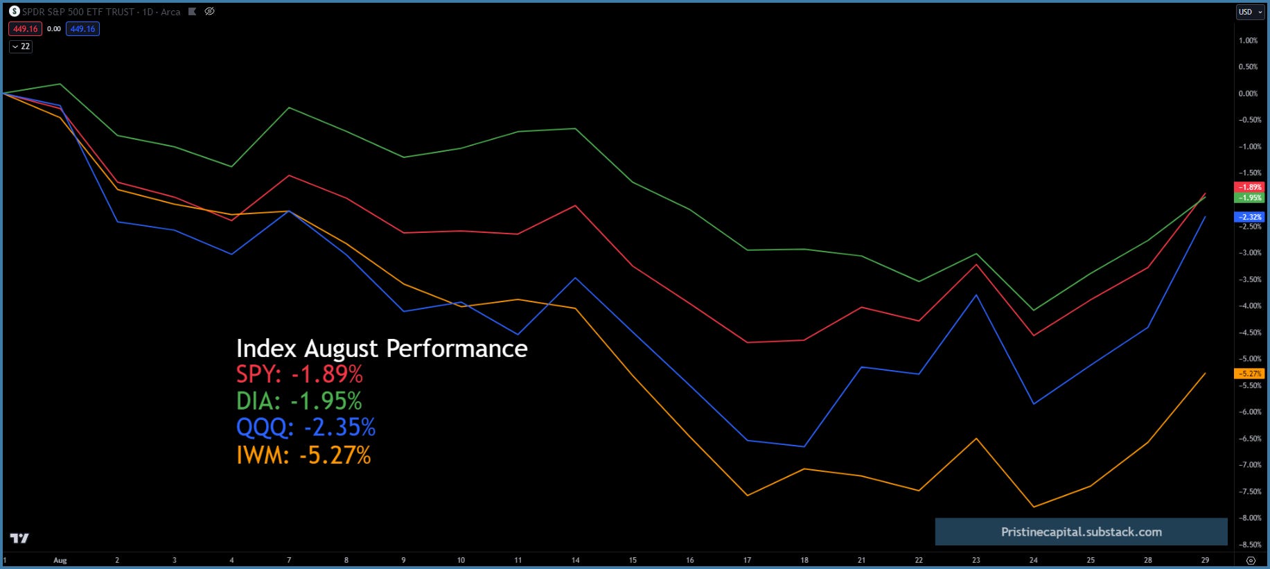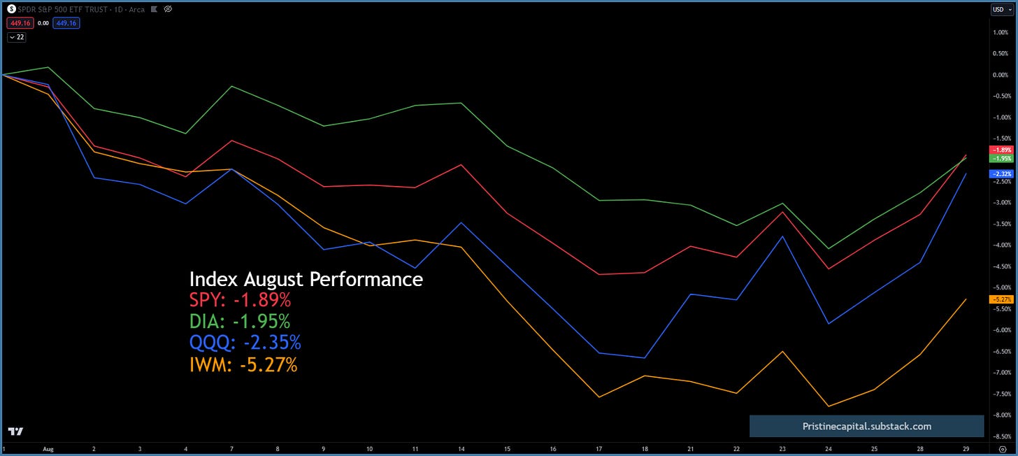 All equity indices are likely to finish the month of August in negative territory, but well off their recent lows.
