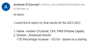It’s official Pristine Fam! We reported our final result for the 2023 US Investing Championship earlier today. +103.5% for 2023 👇