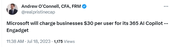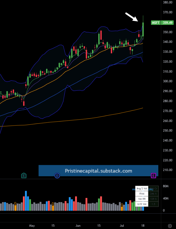 MSFT reported that it would be monetizing its AI offering, and it sent megacap tech flying. I’d imagine that investors who were finally positioning for a selloff for the Nasdaq special rebalance got squeezed…once again! MSFT traded well outside of it’s 3 standard deviation bollinger band! I scrolled back through the chart and was not able to find a similar instance of short-term overbot conditions in this name.
